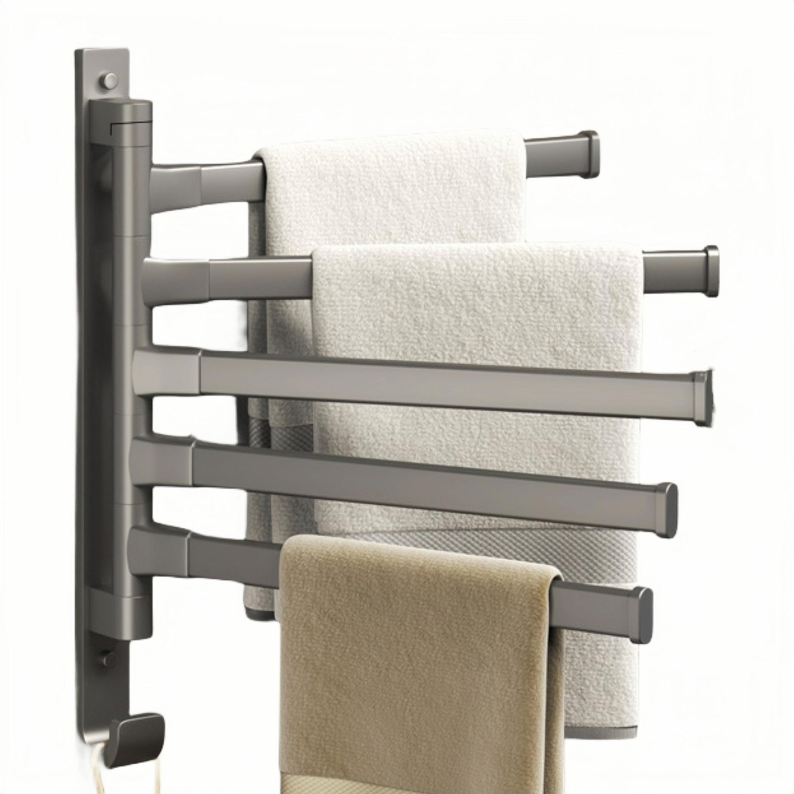 - Praktiškumas: Dėl sukiojamų rankenų rankšluosčius patogu kabinti ir džiovinti, o atsparus drėgmei paviršius užtikrina ilgalaikį naudojimą ir lengvą priežiūrą.