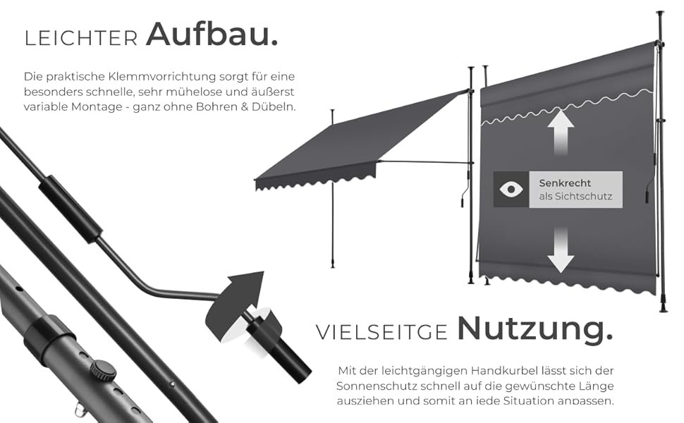 - Praktiškumas: Lengvas montavimas be gręžimo leidžia greitai ir be pastangų sumontuoti markizę, o atsparus oro sąlygoms audinys užtikrina ilgaamžiškumą ir paprastą priežiūrą.